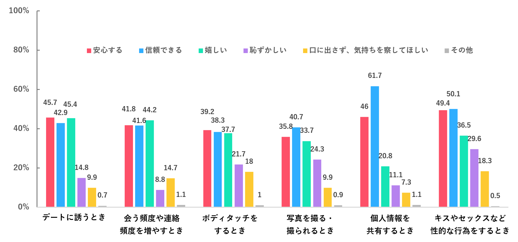 一方で、「断ったことで困ったことや良かったことがあったか」という問いに対して最も多かった回答は「特に困ったことも良かったこともない」(25.5%)となりました。また、「話し合いながら関係を進めることができた」「不安を解消できた」「信頼関係が深まった」といったポジティブな回答も、それぞれ10%程度見られました。さらに、シチュエーション別に「同意を取られること」についての感情についてたずねた設問では、ほぼすべてのシチュエーションにおいて「安心する」「信頼できる」「嬉しい」が4割以上を占めています。「同意」は安心と信頼を育むコミュニケーションであることが示されています。