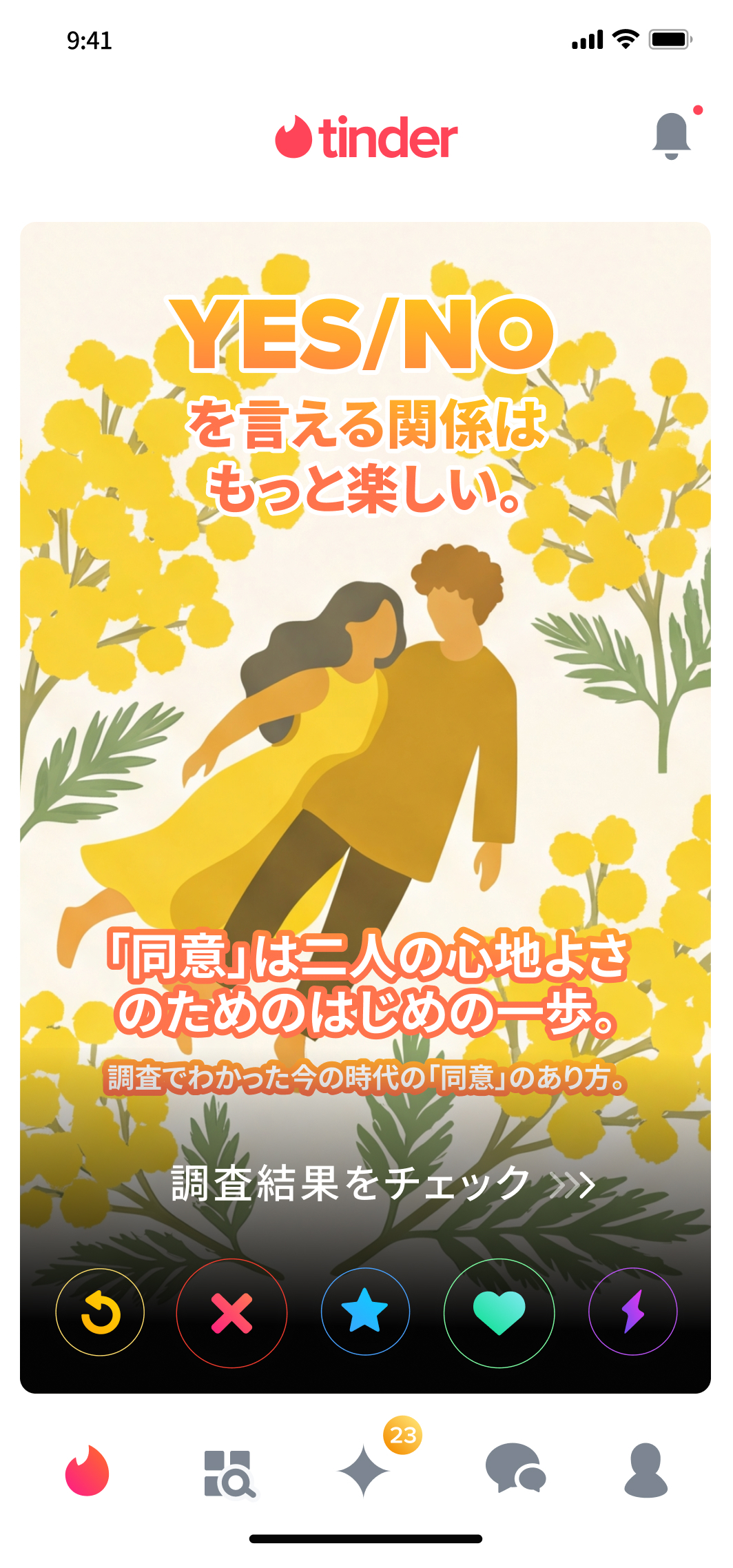 今回の調査結果を受けて、3月4日(水)から国際女性デー当日の3月8日(日)までの間、Tinderアプリ内でも啓発を行います。スワイプ画面内に調査結果を知らせるカードを配信し、「性的同意」に関する理解を深めていただける機会を提供します。