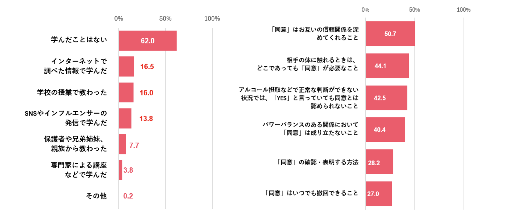 「同意の取り方・伝え方を学んだことがない」と回答した人は全体の62%。なかでも、女性の26〜33歳のグループでは75%にのぼりました。また、「同意はいつでも撤回できる」ことを「よく知っている」と答えた人は全体の27%、「同意を確認・表明する方法」については全体の28.2%に留まりました。